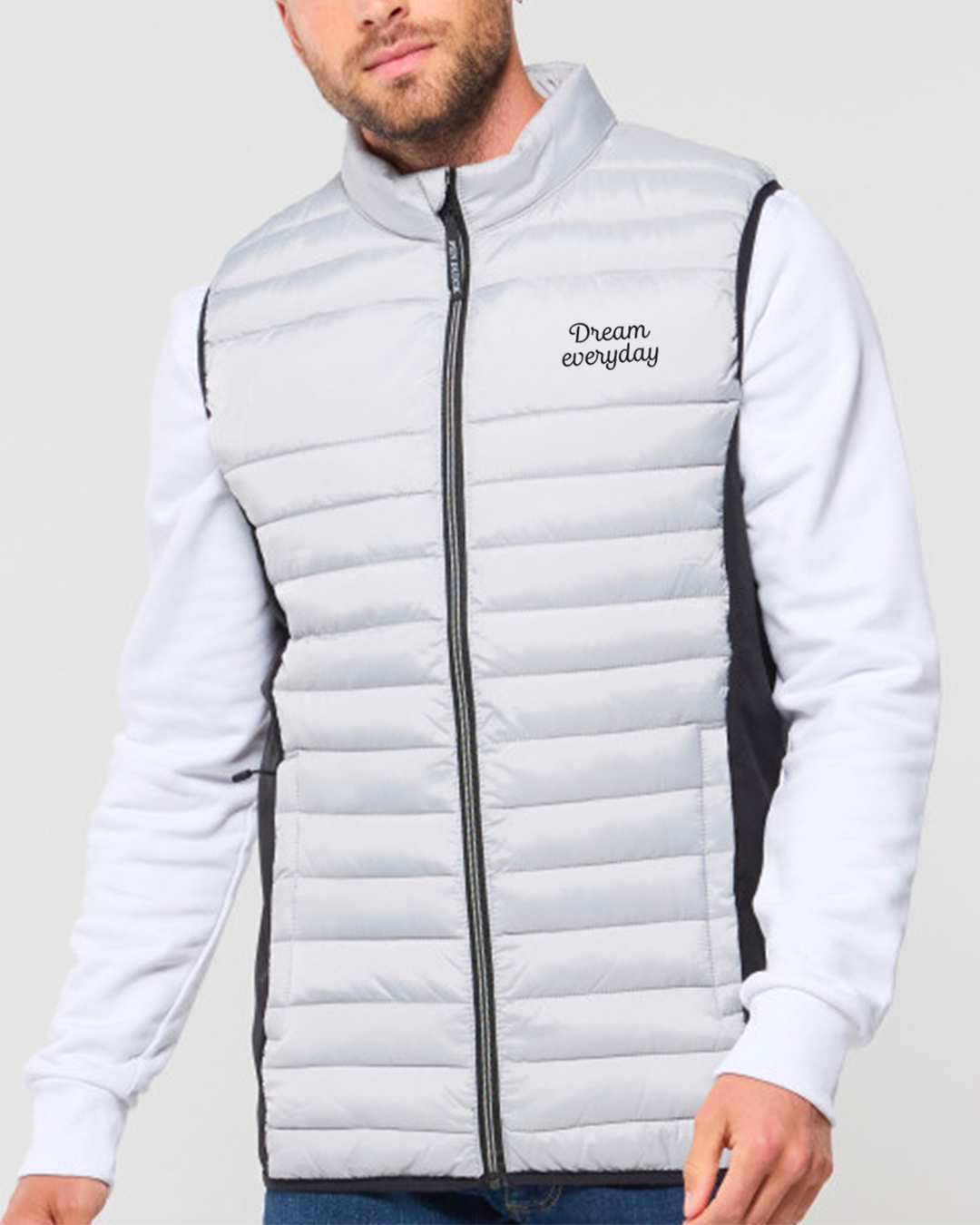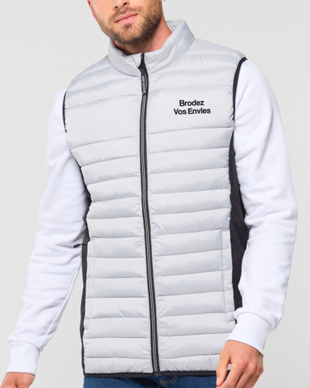 Détails produit – Bodywarmer léger moderne bi-matière. 2 poches latérales zippées. Zips contrastés.