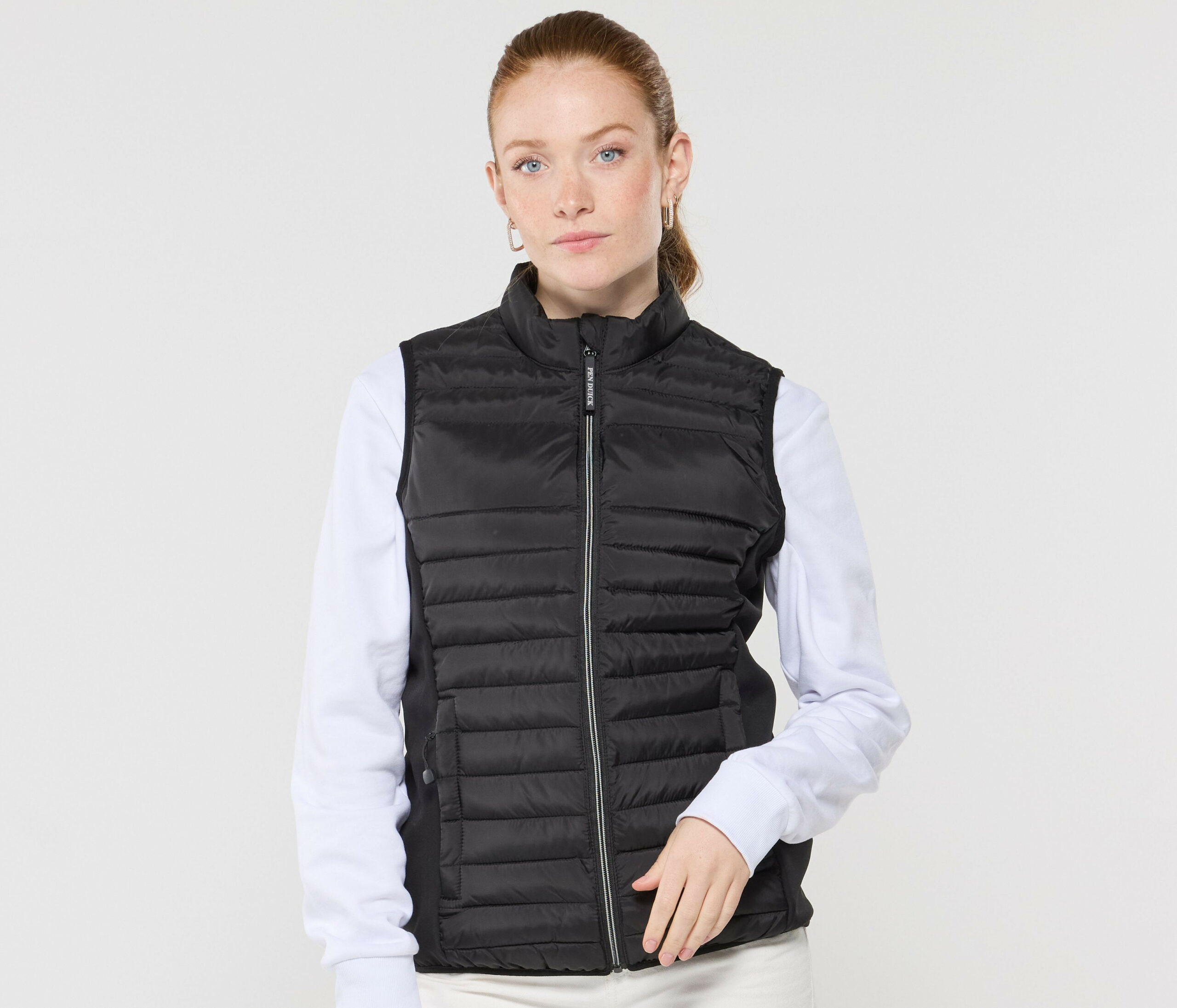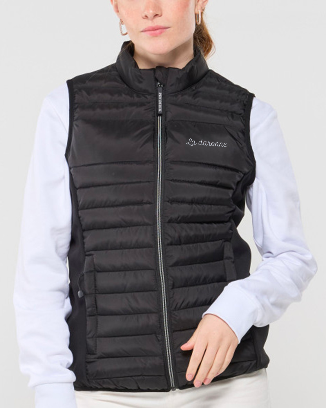 Détails produit – Bodywarmer léger moderne bi-matière. 2 poches latérales zippées. Zips contrastés.